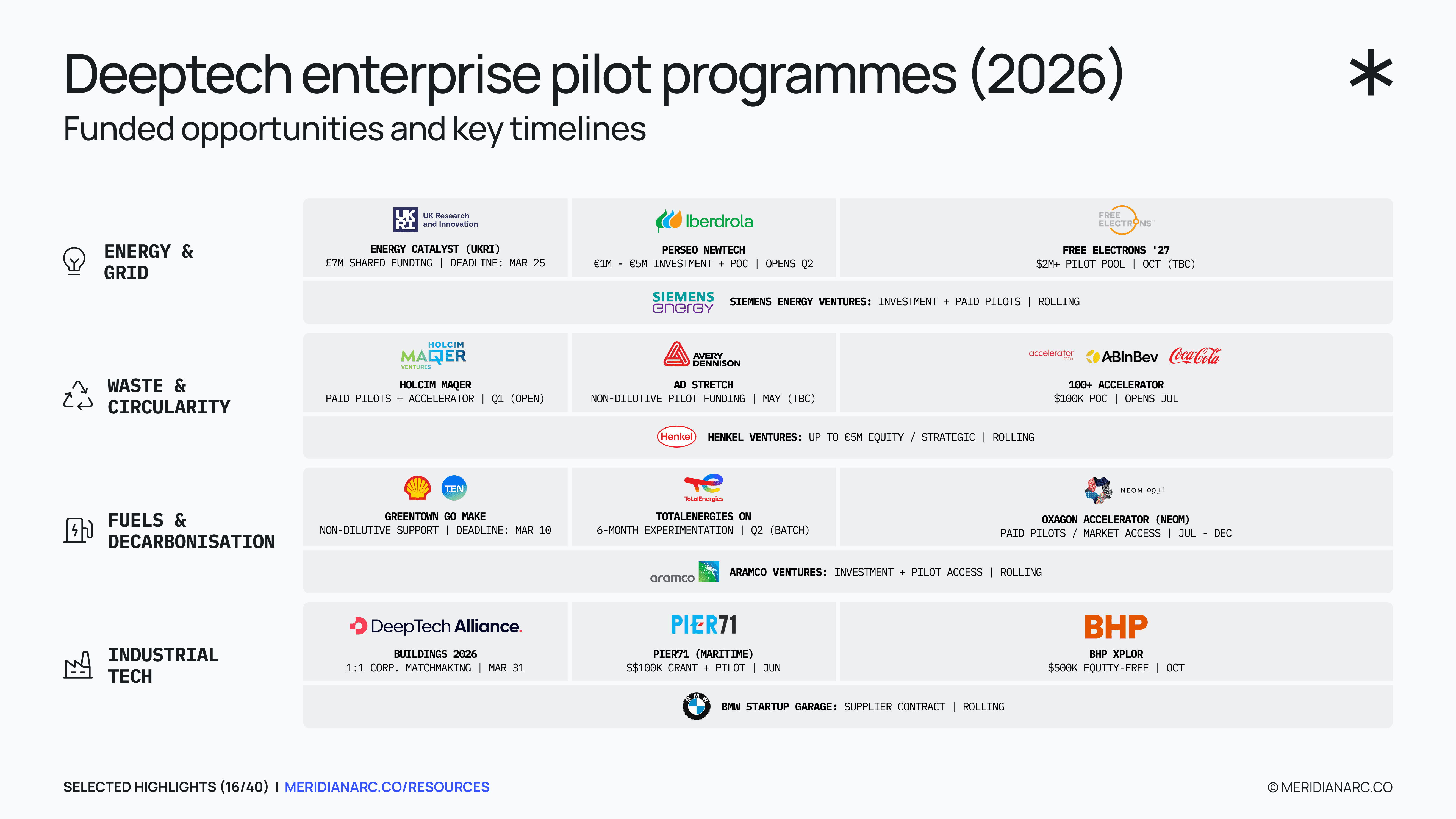 This curated database tracks 40+ verified pilot programmes, commercial mandates, and funded application cycles across Energy, Waste, and Industrial Tech.
